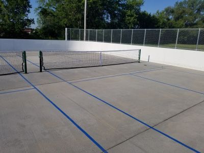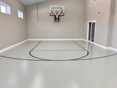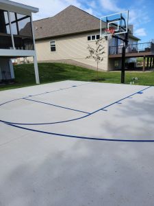 Ok parents, you looking to be the talk of the kids in the Neiborhood in a good way, well whether its indoors or outdoors, we can do just about anything to make life a little more exciting while taking advantage of that unused space, or simply giving the neighborhood kids a safe and exciting place to play, we offer many types of courts i.e… basketball, tennis, pickleball or playground activities i.e… four square, hopscotch, even soccer or football fields have been painted in the backyard using lawn safe paint. We have custom painted on all types of surfaces and places, concrete, asphalt, grass, driveways, patios, basements, pole barns and airplane hangars, these courts can be custom designed to fit just about any area.