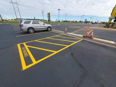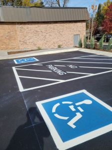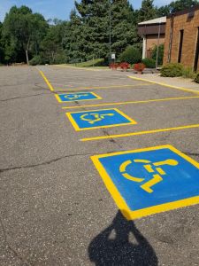 When it comes to commercial parking areas, city and state ordinances require ADA parking known as the American disability act. this means parking lots with public access must have handicap accessible stalls and walkways with wheelchair accessibility and van assessable stalls. This depends on the number of stalls, ramps, or entryways. As a disabled veteran owned business, we are certified in ADA compliance striping and will work with you and your city to ensure you meet the ADA requirements for your area.